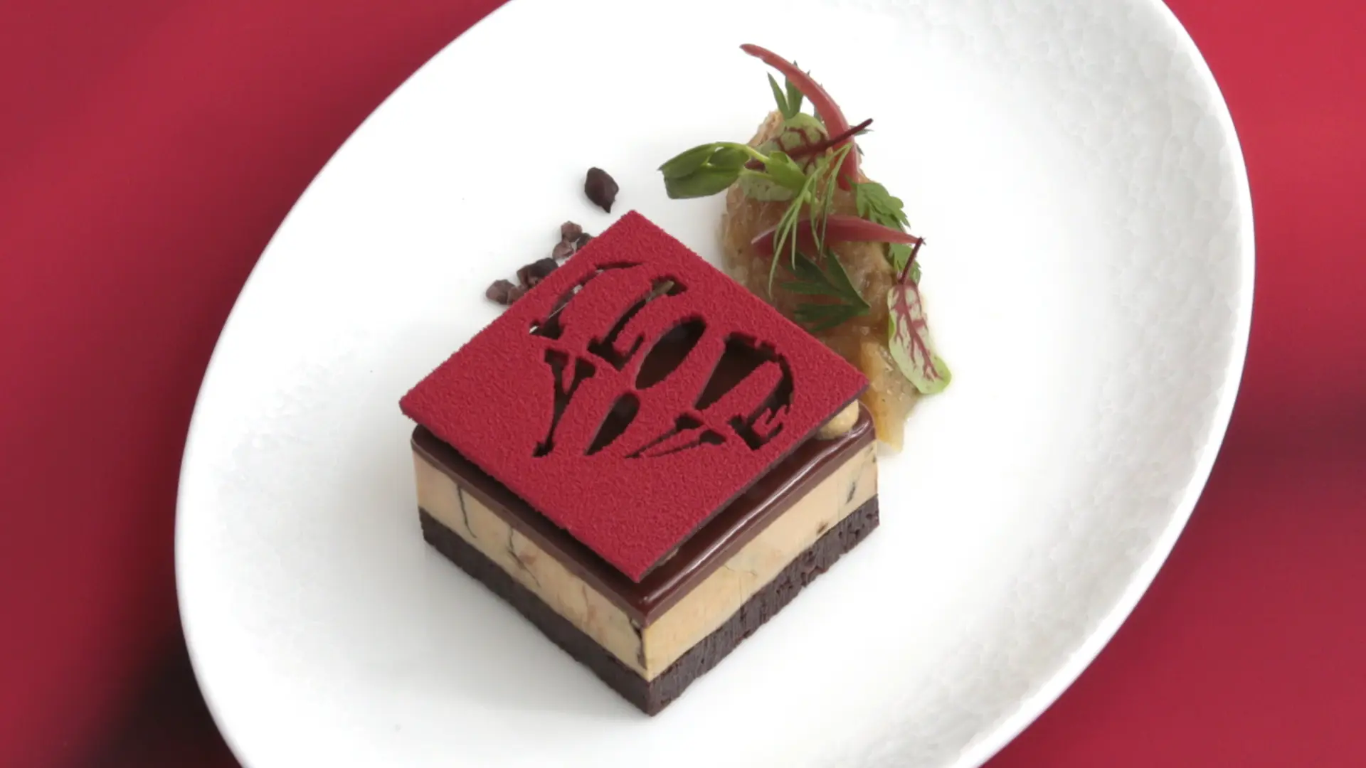Déclarez votre flamme à l'élu(e) de votre cœur avec notre entrée gourmande, associant le croustillant du biscuit cacao à la fleur de sel et l'onctuosité du foie gras au chocolat noir origine Sao Tomé.