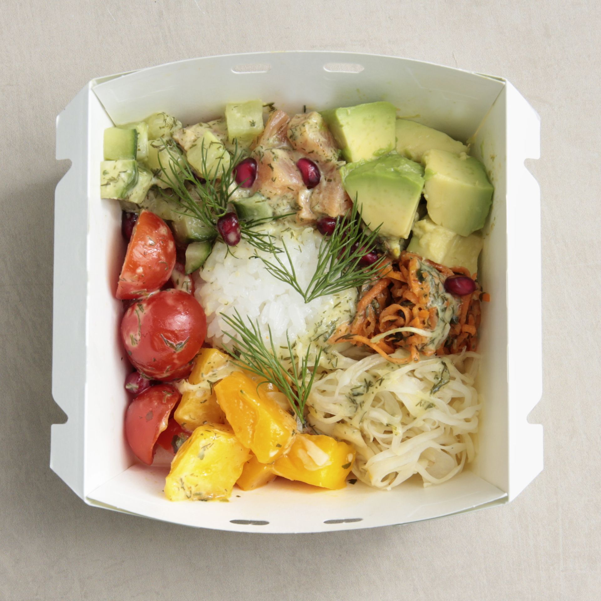 Salade de riz et saumon, mangue et légumes, sauce gravelax