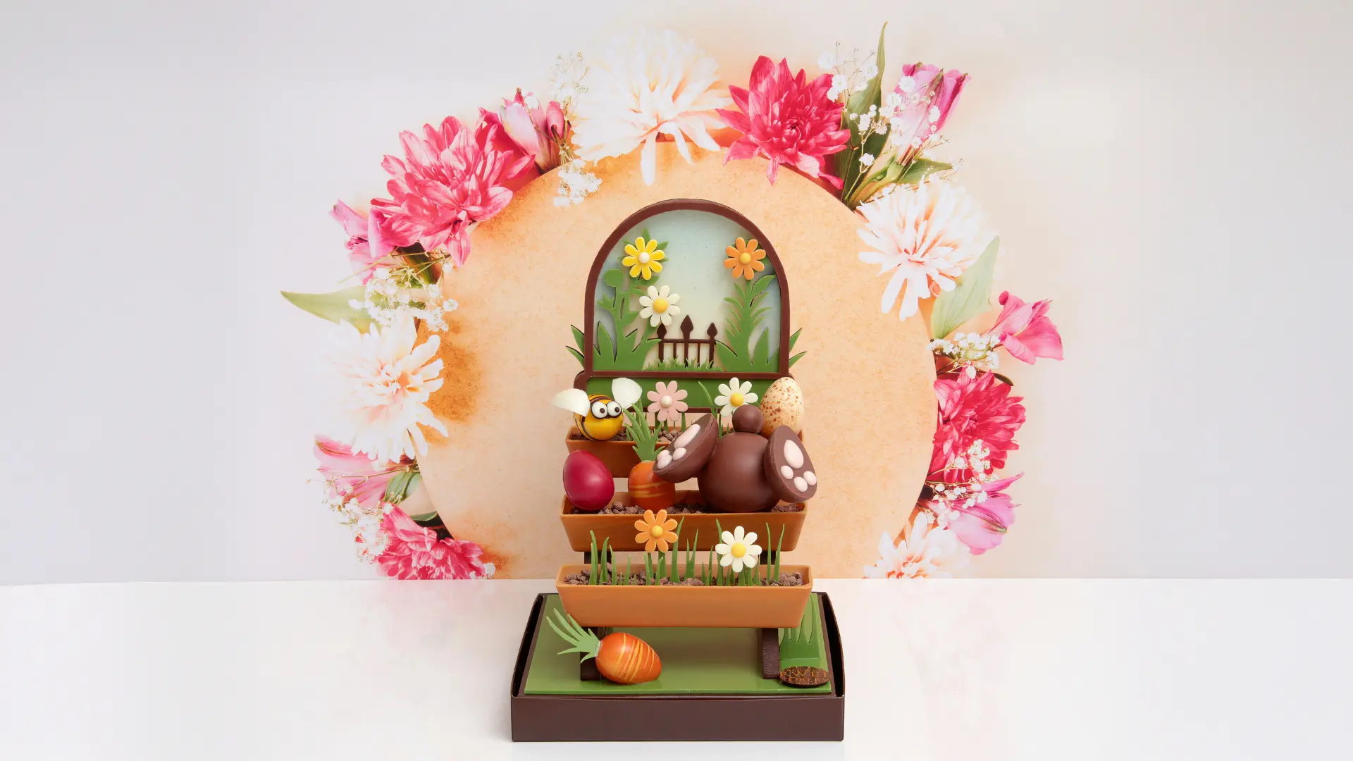 Partez à la chasse aux œufs avec notre jardin de Pâques entièrement confectionné et décoré à la main par nos artisans Chocolatiers. Streusel croustillant, cacahuètes caramélisées et praliné amande-noisette fondant sont à découvrir...